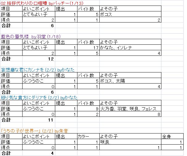 (注:暫定的にかなたが個人的に出したものであり、品評会での審議待ちです) ・一作品提出するにつき+1(小説の中にある挿絵なども一作品として換算する。漫画が複数ページの場合ページ数だけ+) ・よその子を出した場合、小説は一人につき+2 イラストは+1 ・イラストがカラーだった場合+1 ・キャラクターの全身イラスト一体ごとに+1 ・小説のバイト数でも評価(バイト数は 0〜5kb:1点 6〜10kb:2 11〜15kb:3 16〜20kb:5点)